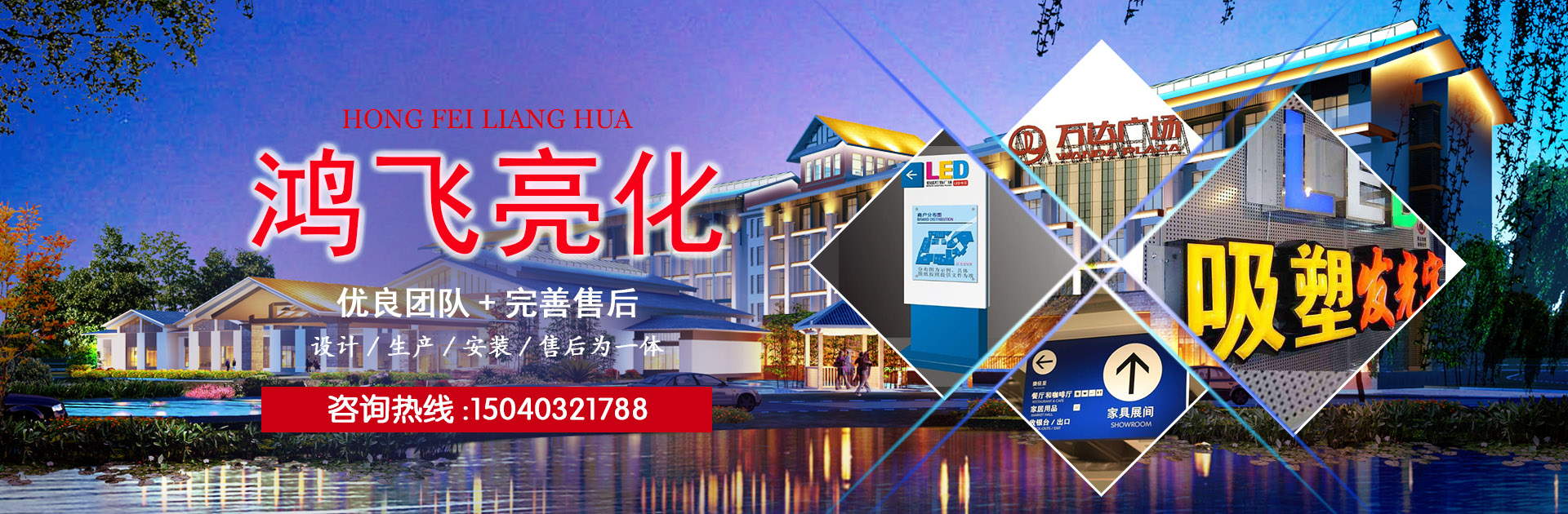 沈陽鴻飛亮化有限公司,成立于2009年,注冊資金200萬,本公司專業從事樓體亮化、LED發光字、樓頂大字、鋼結構工程,是一家集設計、生產、安裝、售后為一體的綜合型公司。公司在不斷的拓展和創新過程中取得了沈陽市城鄉建設委員會頒發的城市及道路照明工程叁級資質,AAA級信用等級證書等一系列榮譽。自公司成立以來,活躍于各個行業,為多家大型企業提供廣告解決方案,并多次承攬沈陽市及周邊城市亮化工程,贏得了客戶及業內人士的一致好評,取得了良好的社會效應?! 」緭碛歇毩S房,配備了一系列的先進生產設備,并且擁有一支技藝精湛素質優良的團隊,真誠的為廣大客戶服務。以誠信謀生存,以質量求發展。沈陽鴻飛亮化有限公司全體員工將以無限的熱情,精湛的技術為廣大客戶服務。..